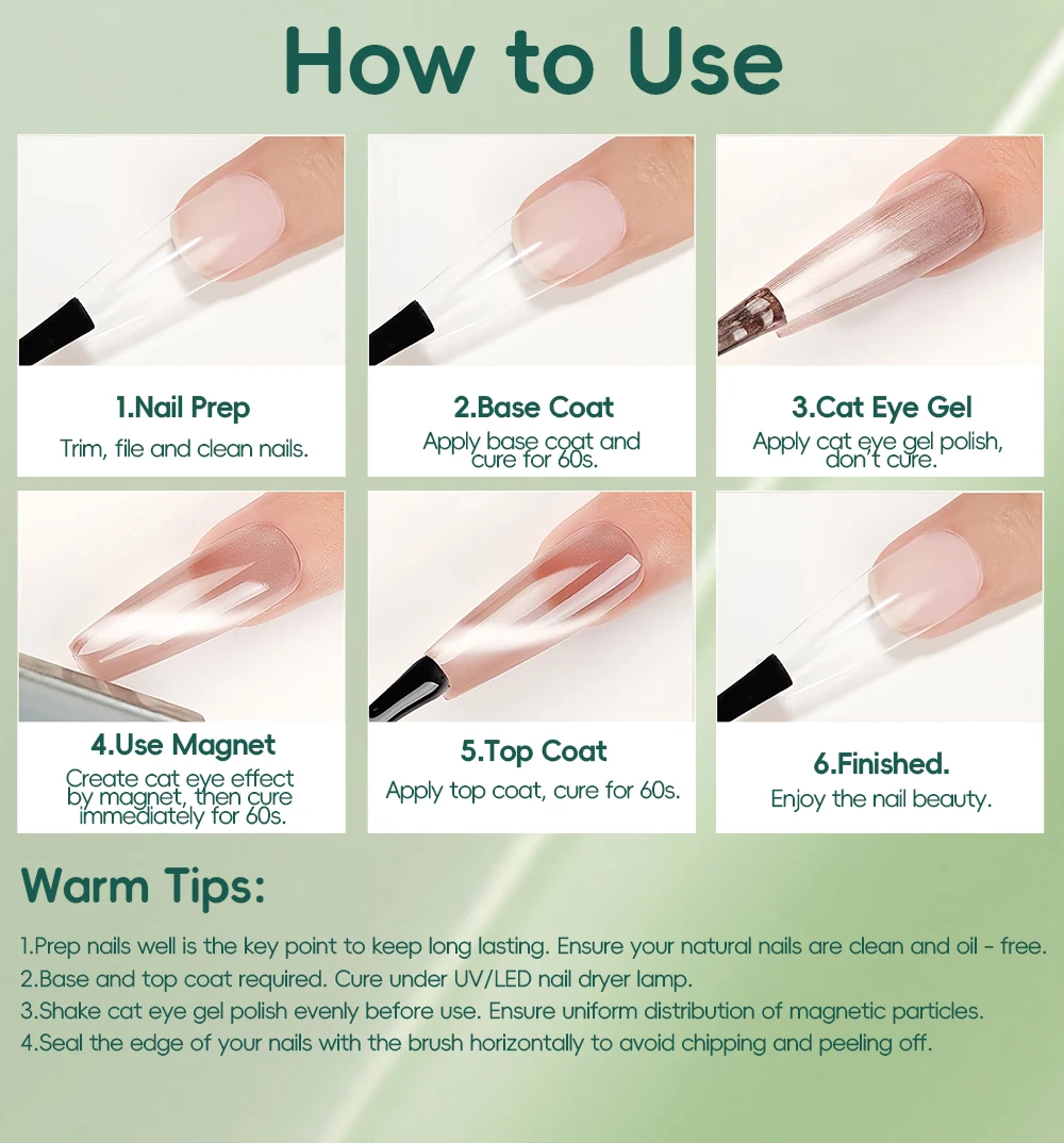 How to Use: Apply base coat, cure. Apply gel color, move magnet over the wet gel to create the cat eye effect, cure. Repeat if desired. Apply top coat, cure. Get ready for nails that truly captivate!